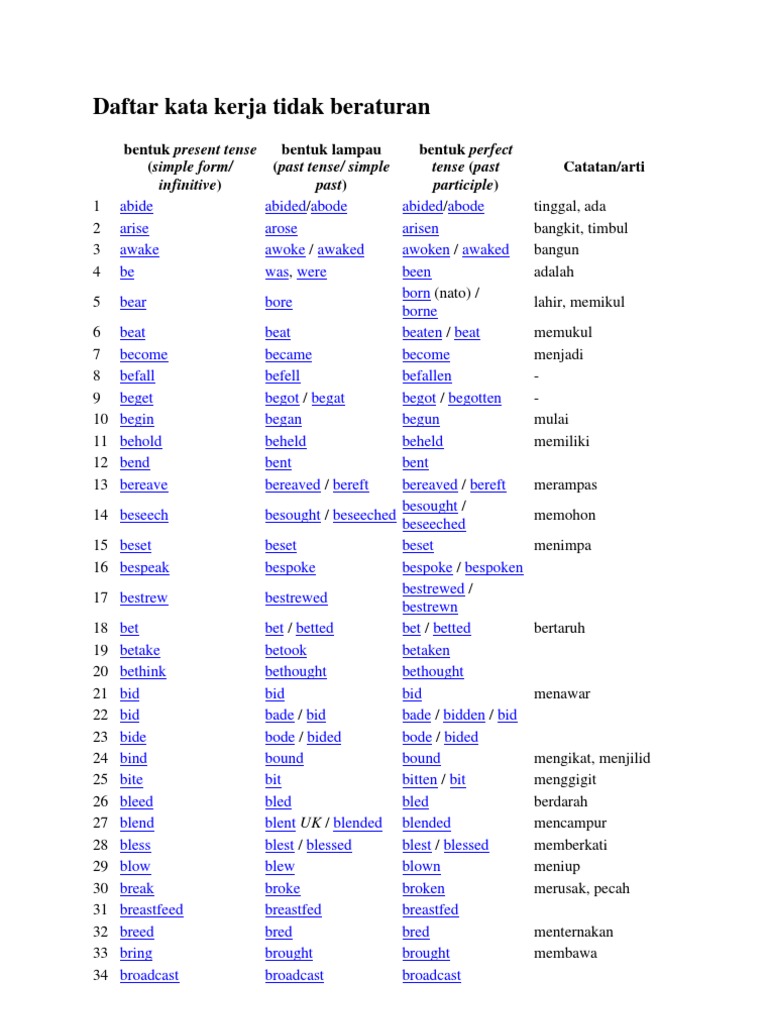 Lihat daftar lengkap irregular verb beserta artinya dalam bahasa indonesia dari a sampai z. Semoga dapat membantu dan memberikan ilmu yang bermanfaat bagi kita semua. Irregular verb adalah kata kerja tidak beraturan.