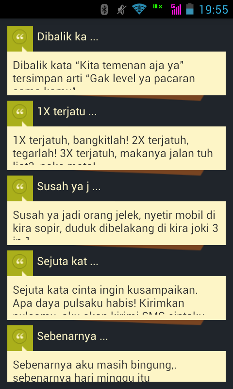Kumpulan kata kata ini sangat lucu dan gokil banget loh jika dijadikan buat status di fb twitter dan media sosial lainnya jika anda merasa kehabisan kata kata untuk di jadikan sebagai update status di facebook silahkan gunakan kata kata lucu homor ini. Hidup kalau biasa biasa aja emang membosankan kamu bakalan butuh sesuatu yang lucu untuk bisa ditertawakan. Kata kata lucu ialah sebuah kata kata yang berisi nilai nilai komedi yang dapat membuat seseorang tertawa.