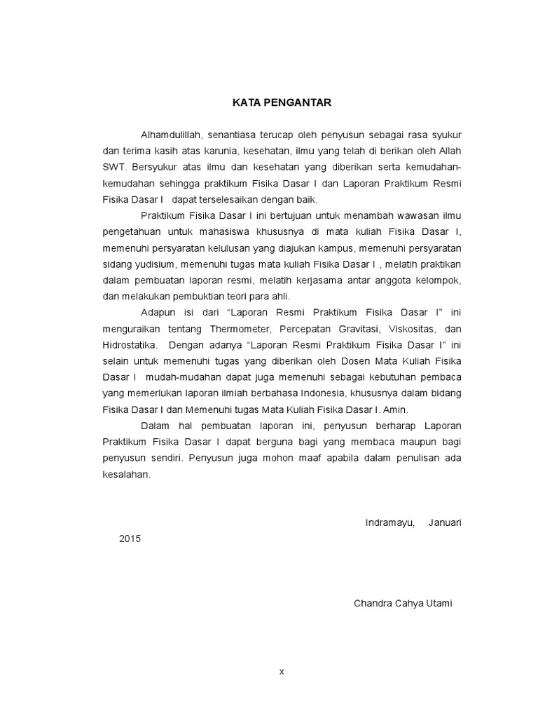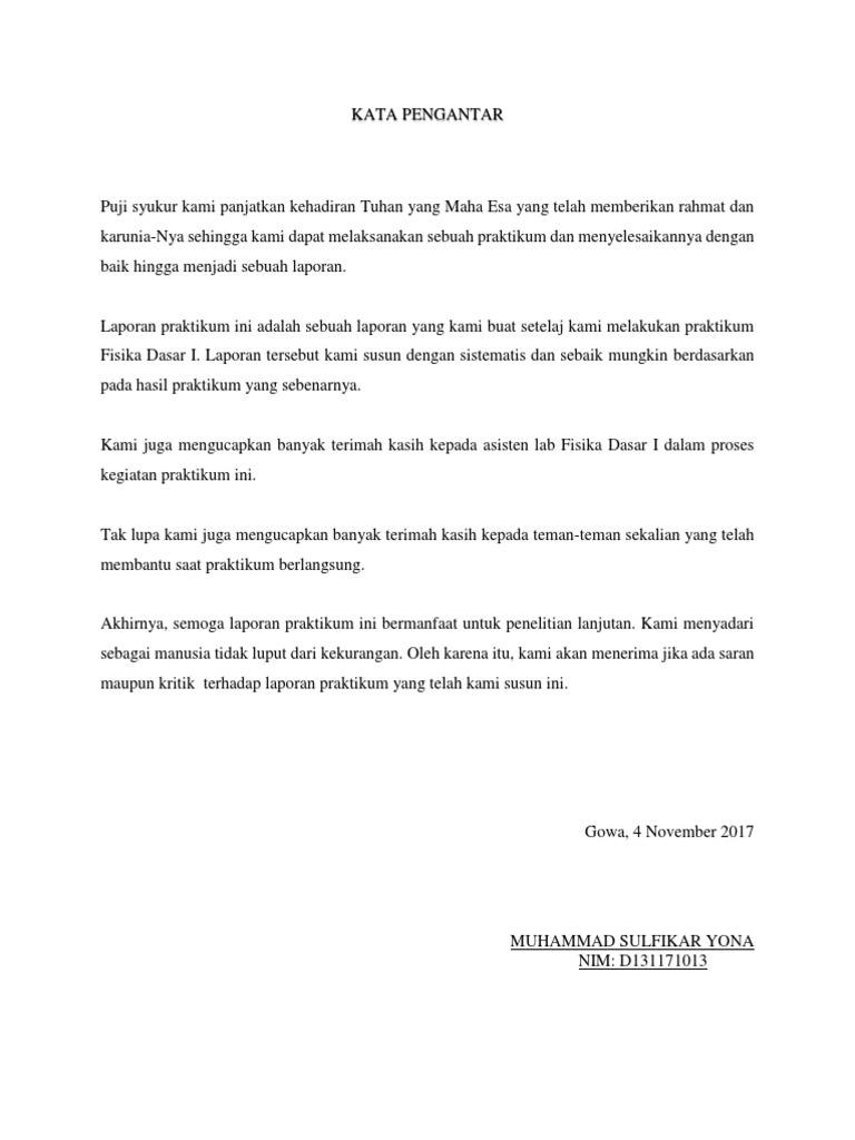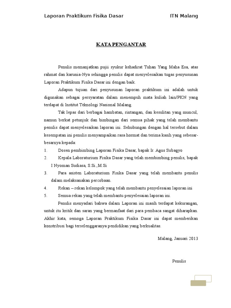 Kata pengantar laporan praktikum fisika. Contoh kata pengantar laporan yang baik dan benar membuat laporan dari suatu kegiatan sering kali kita lakukan di sekolah atau tempat kuliah karena diberi tugas oleh guru untuk menyampaikan suatu informasi melalui makalah. Puji syukur kami panjatkan kehadirat tuhan yang maha esa yme. Karena atas berkat rahmatnya saya dapat menyelesaikan praktikum serta laporan akhir dasar dasar ilmu tanah.