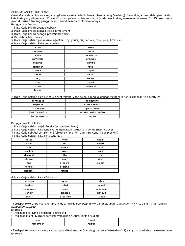 Verbs yang mengikuti tersebut dapat berbentuk infinitive atau dapat juga berbentuk gerund tergantung pada verb yang diikutinya. Semoga daftar kata kerja yang diikuti oleh gerunds dan infinitives di atas dapat membantu anda. Dread takut akan takut kepada dread biasanya merupakan kata kerja yang diikuti oleh gerund.
