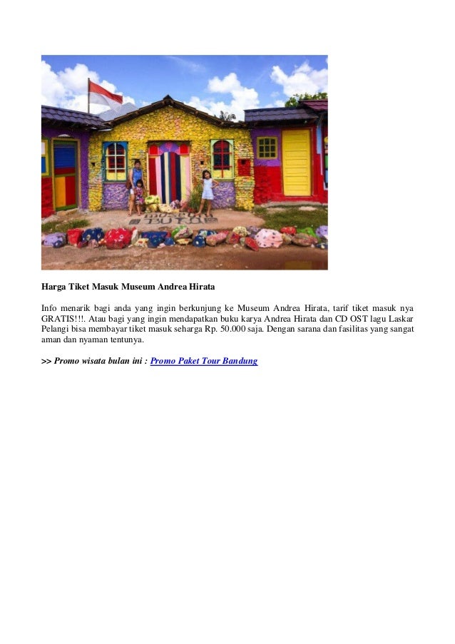 Tetapi tenang ada banyak feedback yang kamu dapatkan dari biaya masuk tersebut diantaranya. Untuk masuk ke museum yang diresmikan pada bulan november 2012 ini pengunjung tidak dikenakan biaya masuk. Museum kata andrea hirata menjadi museum sastra pertama dan satu satunya di indonesia.