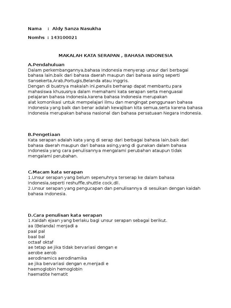 Dalam makalah ini penulis akan memaparkan bagaimana tata bahasa yang benar tentang kata serapan sehingga kita memahami dan dapat menerapkan aturan berbahasa yang baik dan benar dalam kehidupan sehari hari terlebih dalam acara resmi. Ktp mu sim nya stnk ku k. Man wan wati dan ita.