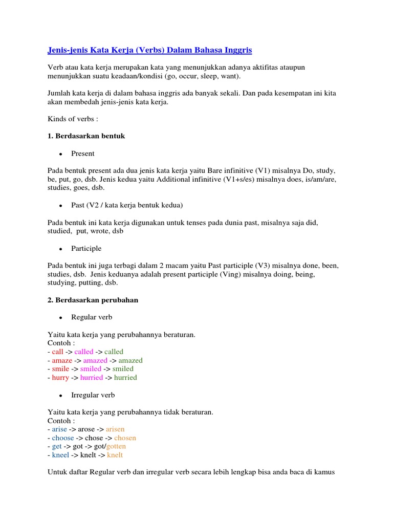 Contoh penggunaan dalam kalimat adalah. Bentuk verb atau kata kerja dalam bahasa inggris ada dua macam regular verb atau kata kerja beraturan dan irregular verb kata kerja tidak beraturan.